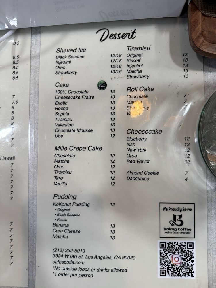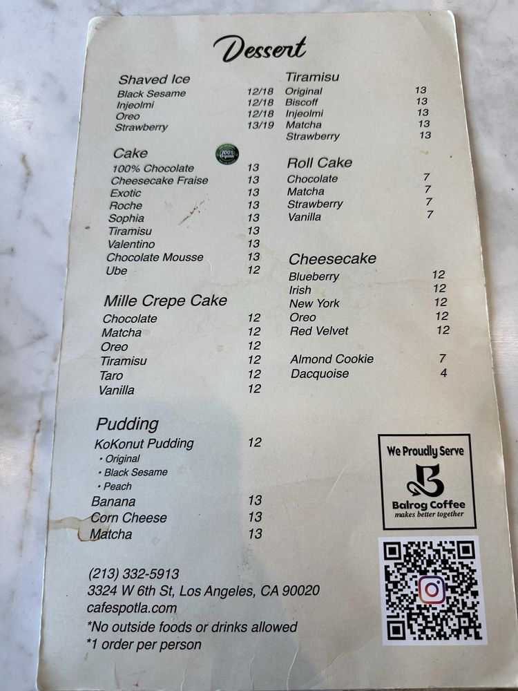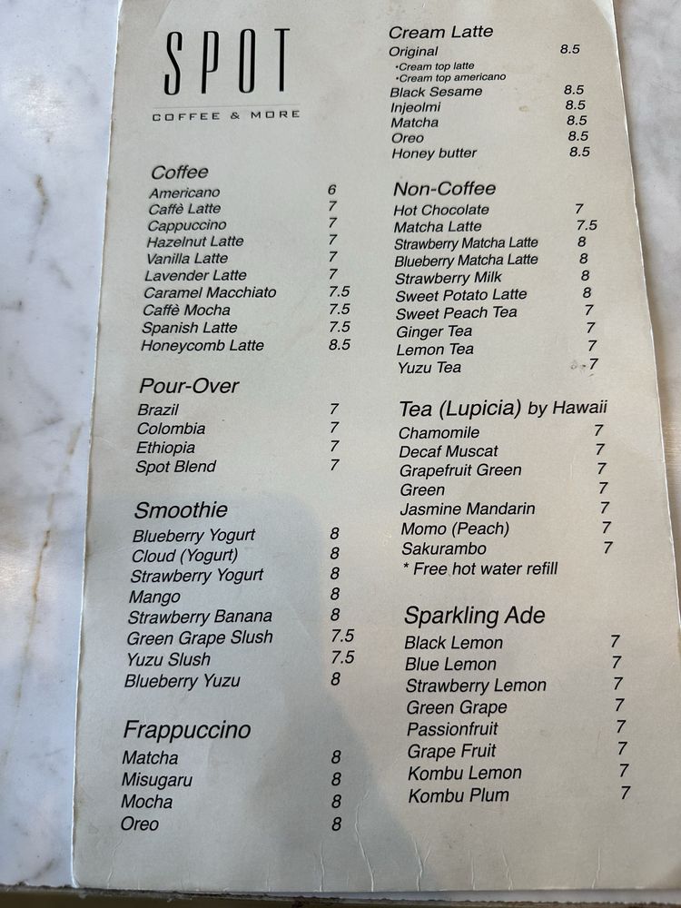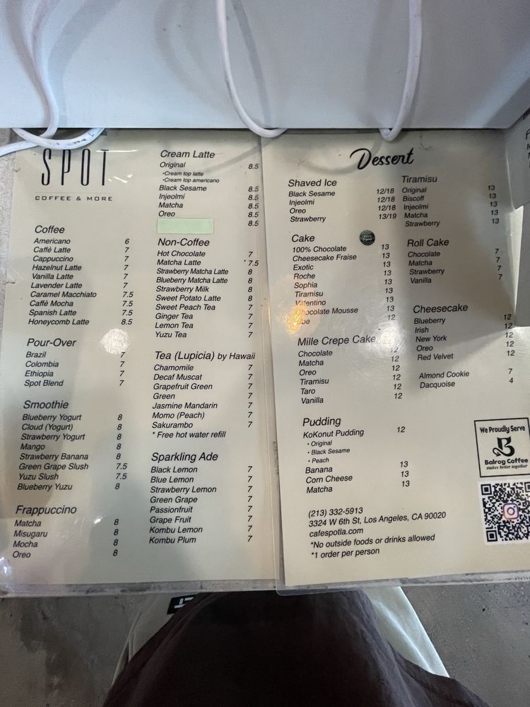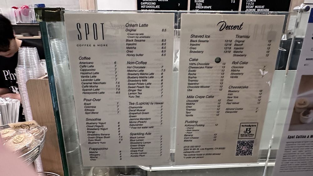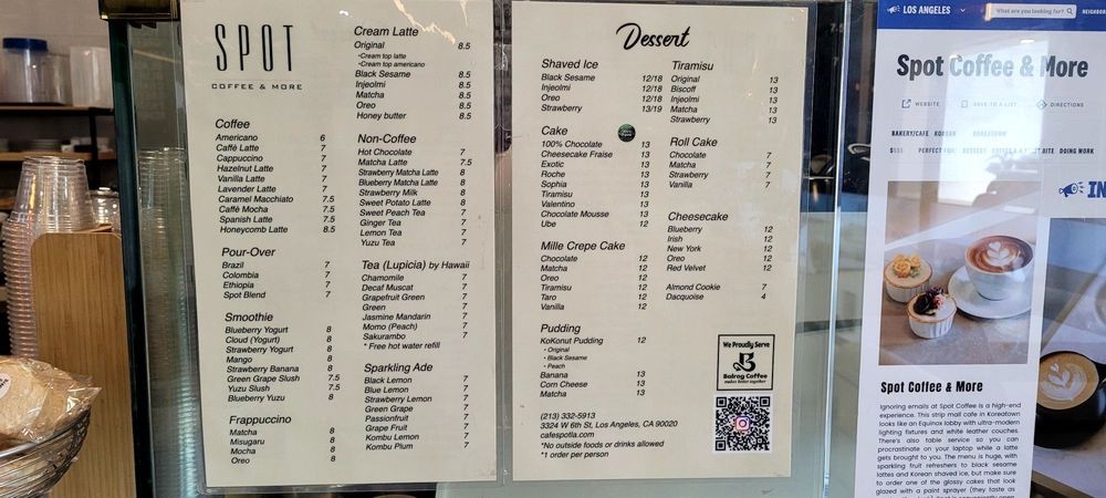 Spot Coffee & More in Los Angeles offers a cozy atmosphere with a variety of Asian-inspired drinks and desserts. Customers praise the unique Honeycomb latte, blueberry matcha latte, original cream latte, and pistachio crepe cake. The orange blossom tiramisu stands out for its rich flavor profile. While some find the prices a bit high, the quality and selection make it a great spot for a treat or a business meeting. The ambiance is warm, the staff attentive, and the drink menu impressive. With both indoor and outdoor seating, Spot Coffee & More is a must-visit for those looking for a delightful coffee shop experience in Koreatown.